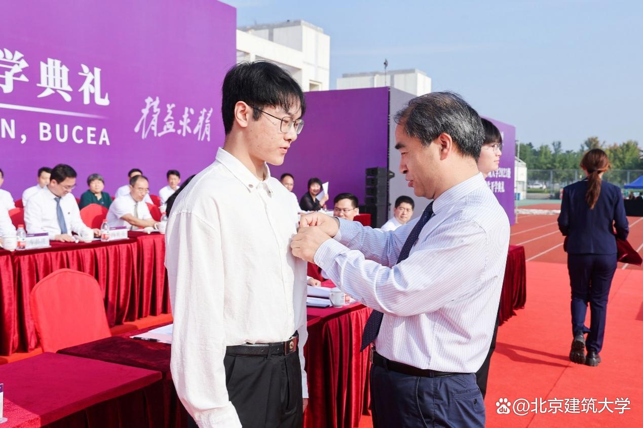 党委书记李军锋为新生代表佩戴北京建筑大学校徽。