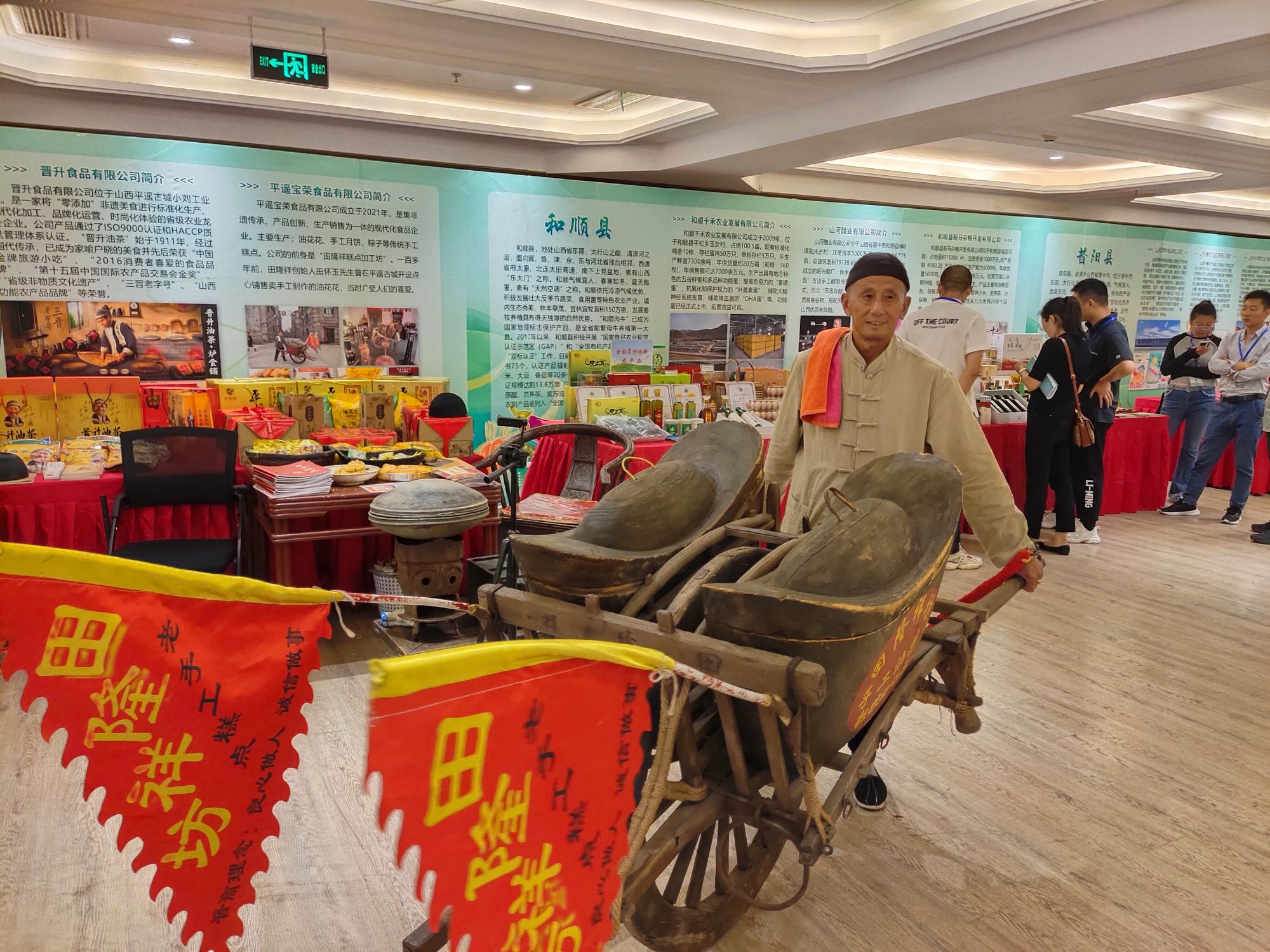 活动现场,晋中市各地的农产品集中亮相,以各种方式进行展示推销。平遥还将地方小吃油花花的“作坊”带到现场,装进有着400多年历史的“元宝”形手推车,引来众多人围观。