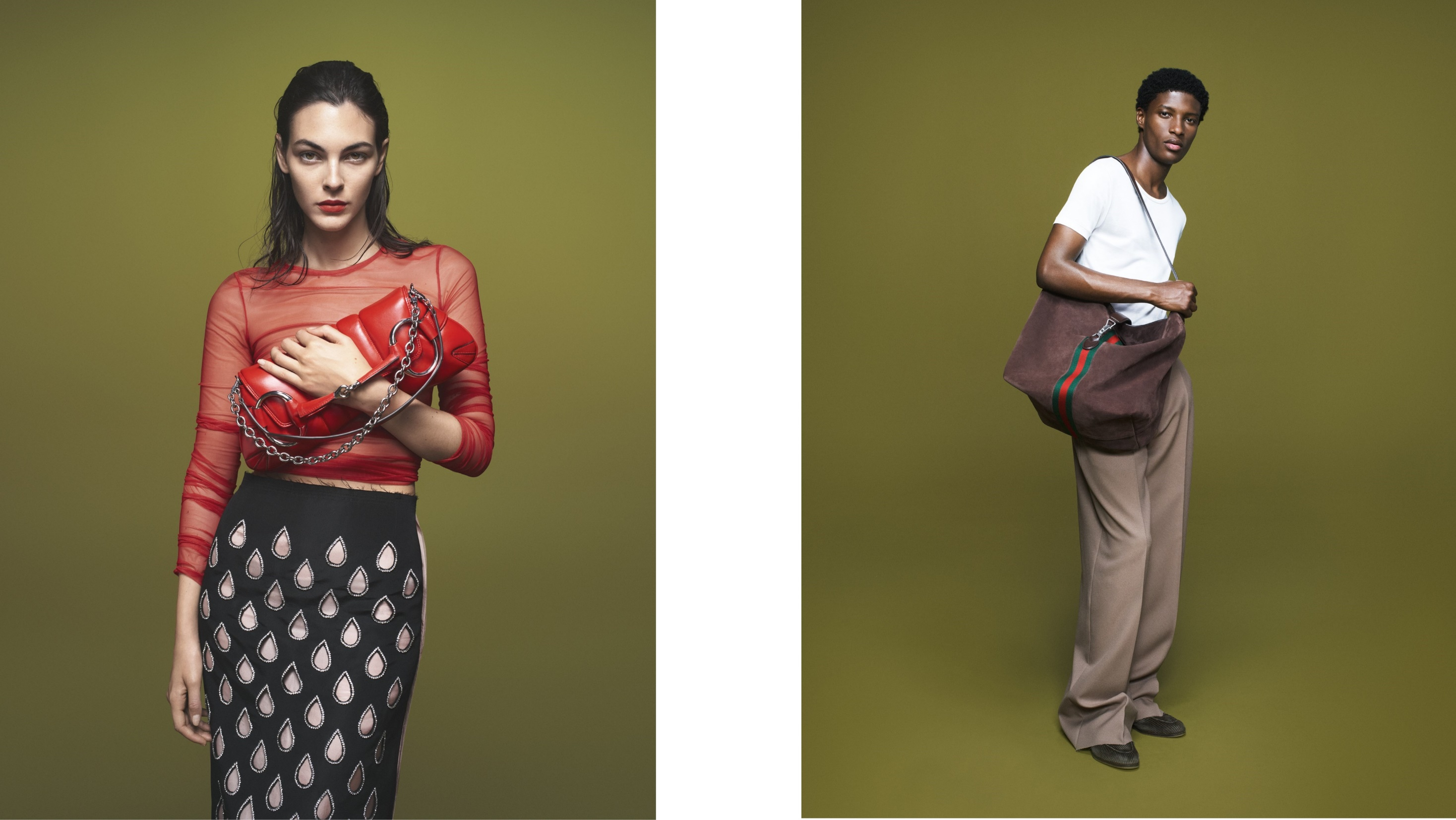 古驰推出2023秋冬系列广告形象大片,Vittoria Ceretti、Aboubakar Konte及Brando Erba出镜演绎,由摄影师David Sims于米兰执镜拍摄。广告大片中的黄绿色背景及电梯置景,令人回想起2月发布的2023秋冬女装系列秀场。全新广告大片展现标志性成衣廓形及配饰造型灵感源自历代典藏创作,其中强势回归的马衔扣链条手袋(Gucci Horsebit Chain)便以当代之姿焕新演绎典藏之作,成为秋冬广告大片中迷人的风格焦点。