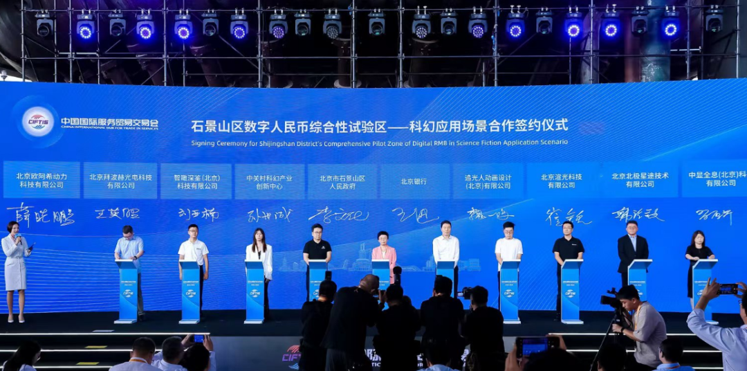 在2023服贸会石景山国际开放合作论坛上,石景山区人民政府、北京银行与科幻创新中心、追光人科技等8家企业签约,共同建设数字人民币科幻应用场景,进一步拓展北京市数字人民币试点新方向,达成“科幻贷”合作意向,并首发“长安三万里”科幻硬钱包,标志着石景山区“数字人民币综合性试验区”启航。