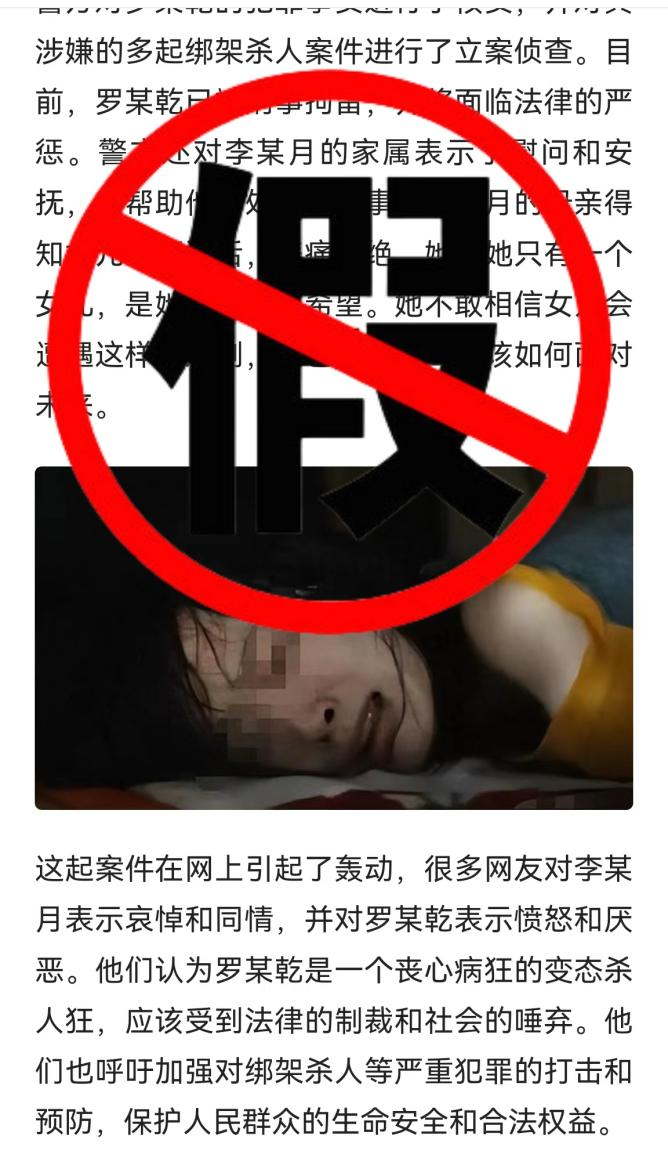 近期,西双版纳网警在工作中发现,一网民在某网络平台发布一篇题为“云南女大学生失踪4天后被发现只剩头颅,凶手自称是报复社会”的文章。文章内容称:“2023年8月4日,云南省勐海县发生了一起令人震惊的命案。一名22岁的女大学生李某月,在独自返校的途中失踪4天后遇害。”该文章发布后,引发广大网民热议和关注,造成不良社会影响。