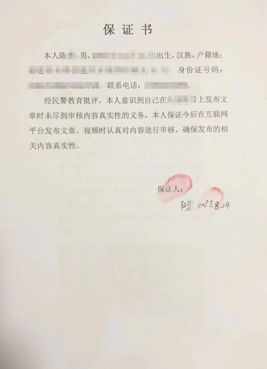 属地公安机关对陈某进行了批评教育,陈某认识到自身错误,及时将相关贴文删除,并写下保证书,承诺今后在互联网平台发布文章、视频时,注意审核把关,确保发布内容的真实性。