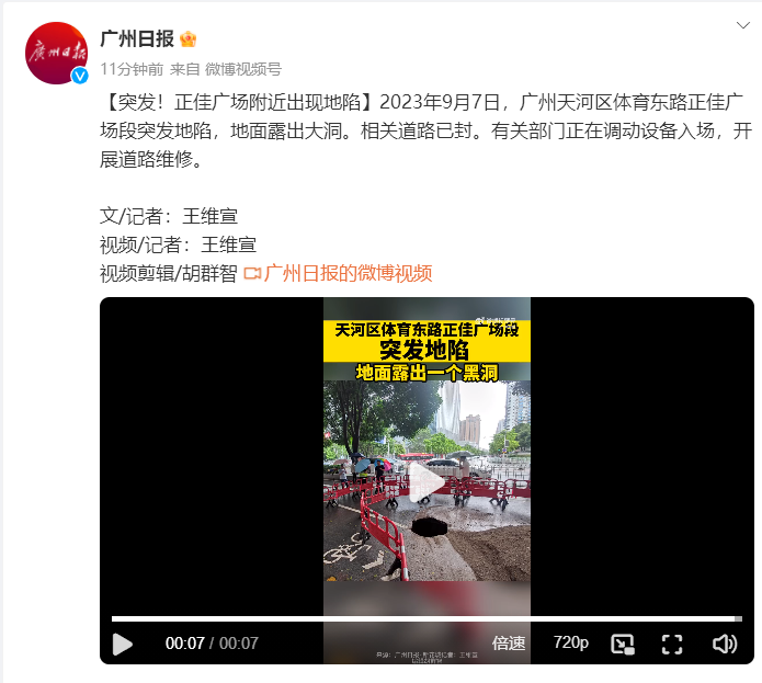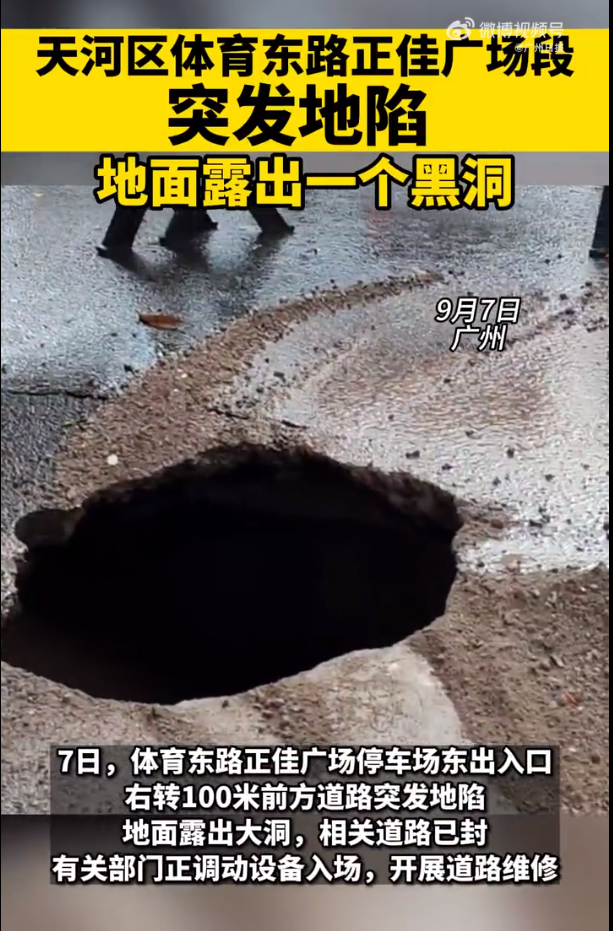 2023年9月7日,广州天河区体育东路正佳广场段突发地陷,地面露出大洞。相关道路已封。有关部门正在调动设备入场,开展道路维修。