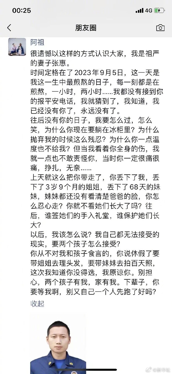 5日,福州市永泰县消防救援大队消防员陈祖严、胡旭东在台风抢险救援中被洪水卷走,不幸牺牲。陈祖严的妻子在朋友圈写下催泪长文。“下辈子你要等我啊,别又自己一个人先跑了好吗?”