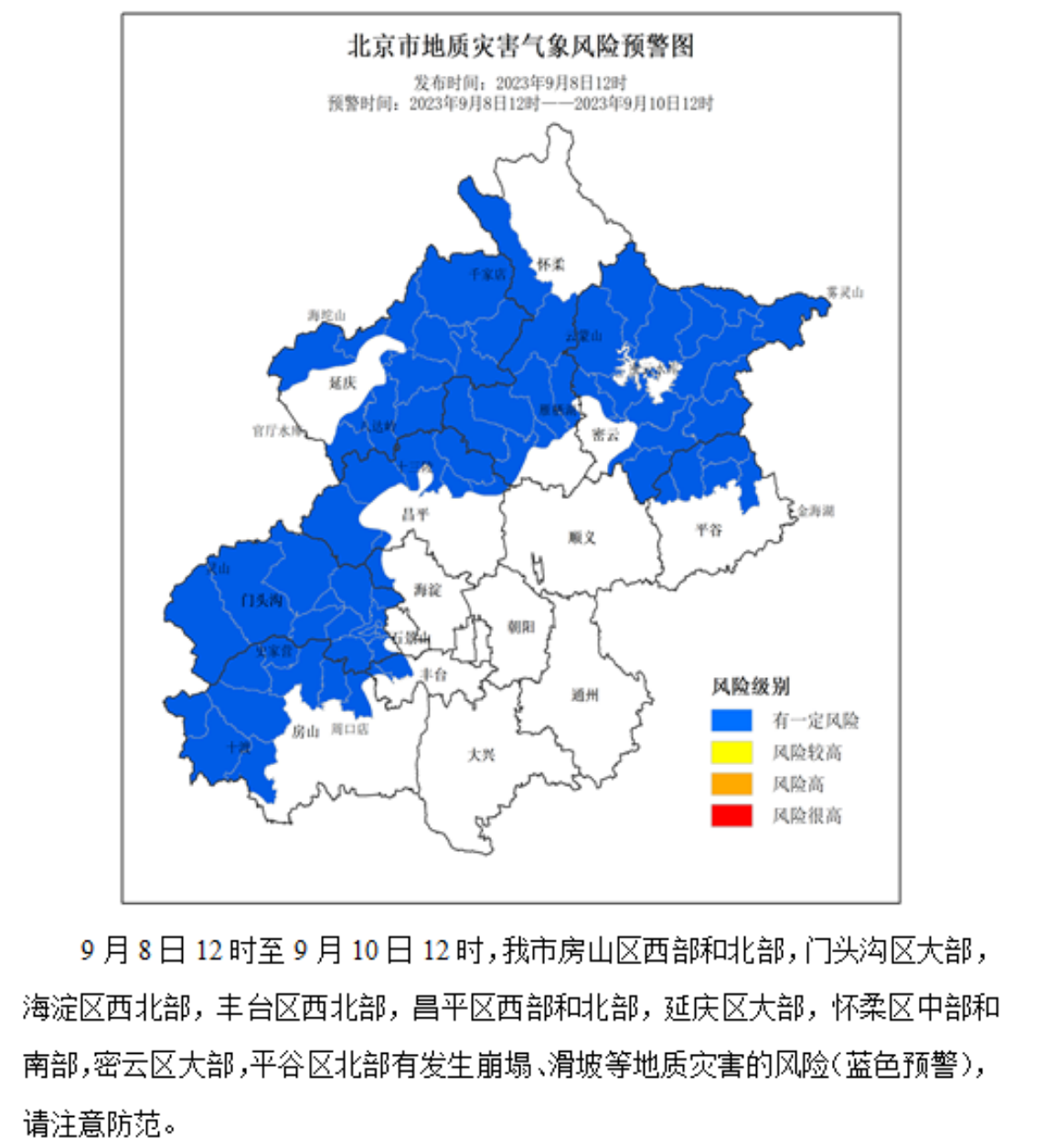 9月8日10时,市气象台发布的暴雨蓝色预警显示,诸多郊区将出现暴雨,山区和浅山区发生地质灾害的风险较高,路面湿滑、能见度低。