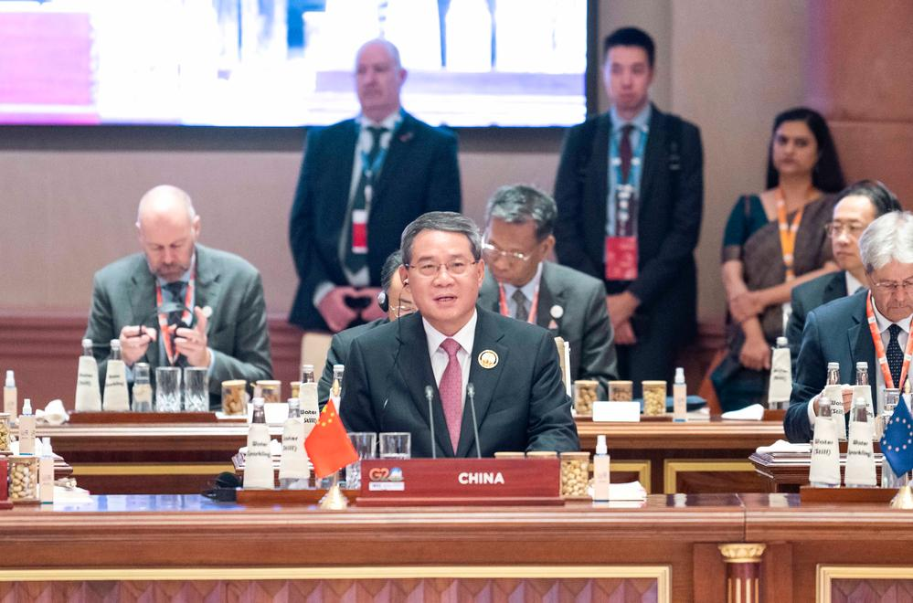 当地时间9月9日上午,国务院总理李强在印度新德里出席二十国集团领导人第十八次峰会第一阶段会议并发表讲话。 新华社记者 李涛 摄