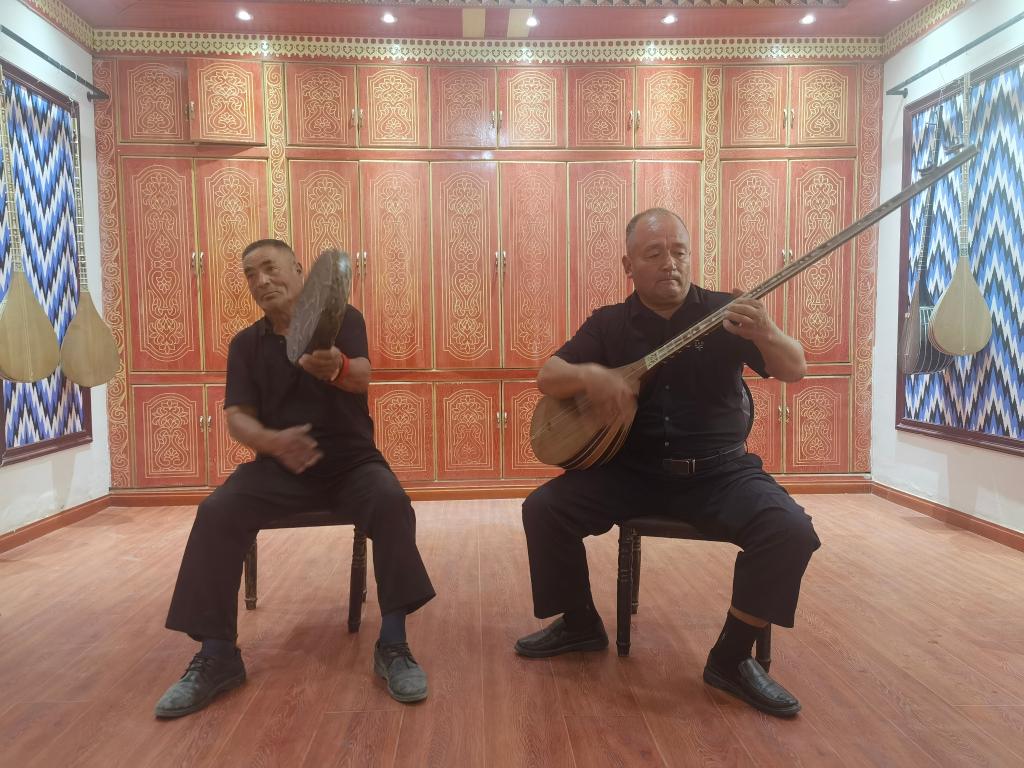 和田地区和田县罕艾日克镇稻香村村民在演奏乐器。(9月5日摄)新华社记者 张大鑫 摄