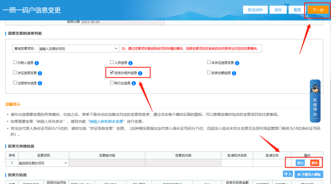 三、一照一码户登记信息变更页面,在此页面勾选“投资方相关信息”,然后在下方“投资方信息列表”维护投资方信息(可增加、删除和修改),全部填写完成后点击页面右上角的“下一步”提交即可。