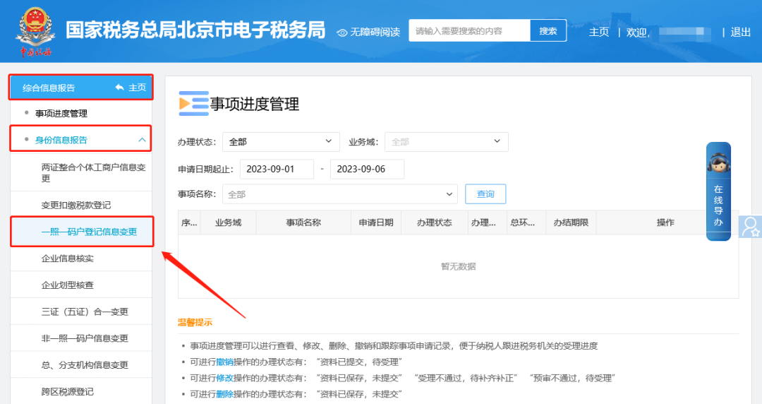 二、综合信息报告—身份信息报告—一照一码户登记信息变更。