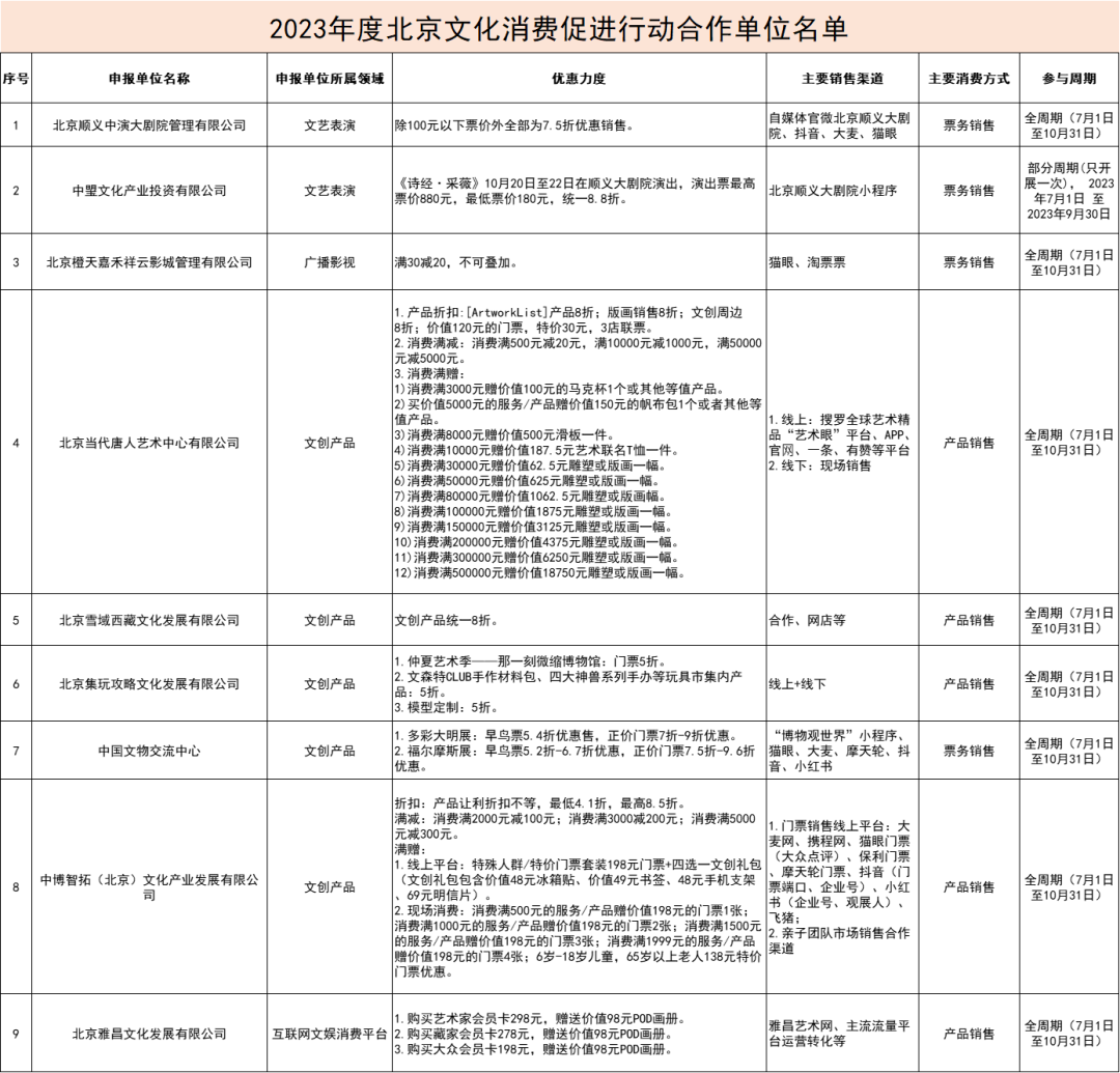 2023年度北京文化消费促进行动合作单位名单于近日公布,顺义区9家单位入选。北京文化消费促进行动推出若干消费促进活动、消费场景及惠民措施,进一步加大惠民力度,将持续至10月底。