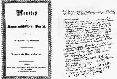 《共产党宣言》第一版封面(左)和马克思所写《共产党宣言》草稿仅存的一页(头两行字为马克思夫人燕妮所写) 图源:新华社