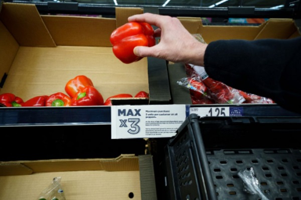 这是2月23日在英国曼彻斯特一家超市拍摄的蔬菜货架上的限购通知。按照通知,每名顾客一次只能最多购买3个彩椒。图源:新华社