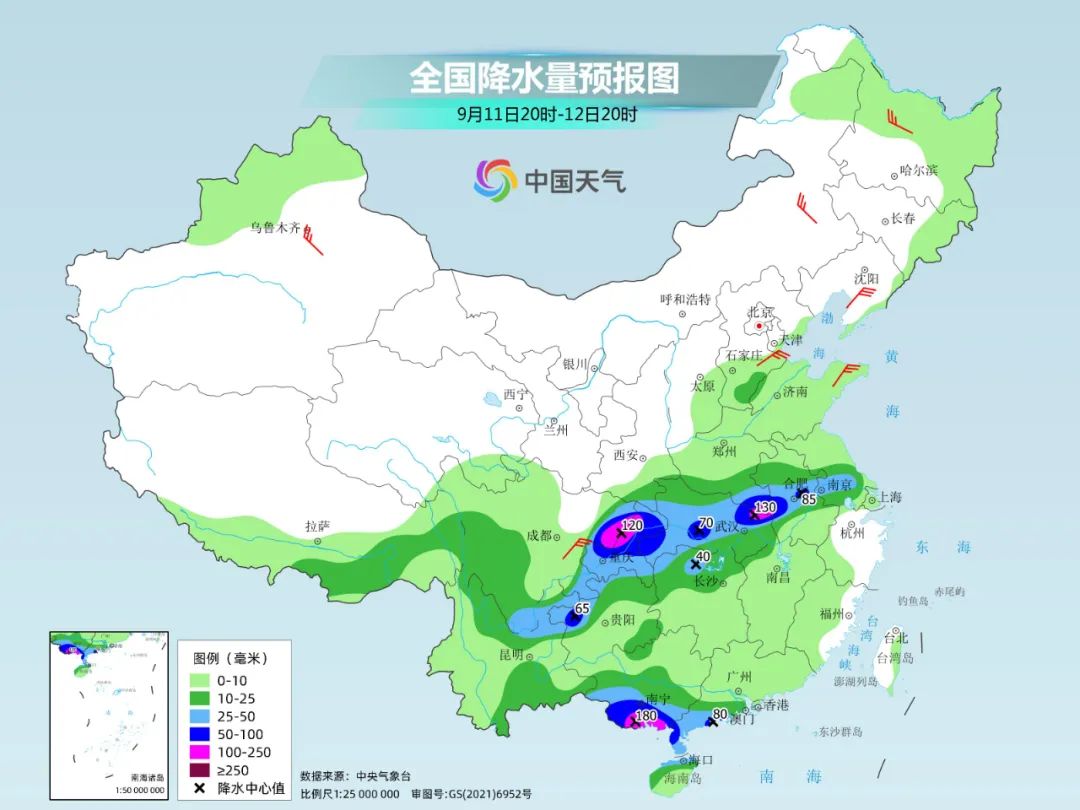 其中,今天夜间到明天,四川东北部、重庆北部、贵州西北部、河南东南部、湖北中部和东北部、安徽中部等地部分地区有暴雨或大暴雨。