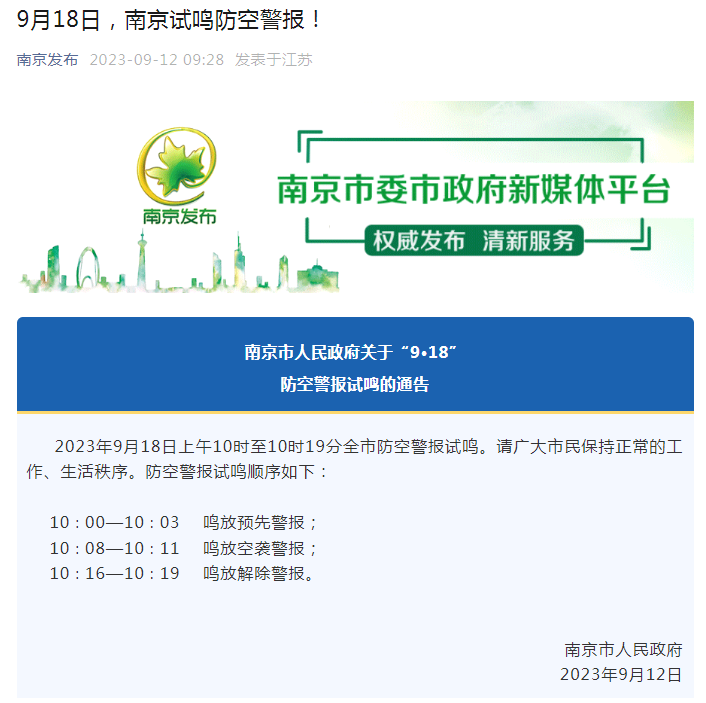 2023年9月18日上午10时至10时19分全市防空警报试鸣。请广大市民保持正常的工作、生活秩序。防空警报试鸣顺序如下: