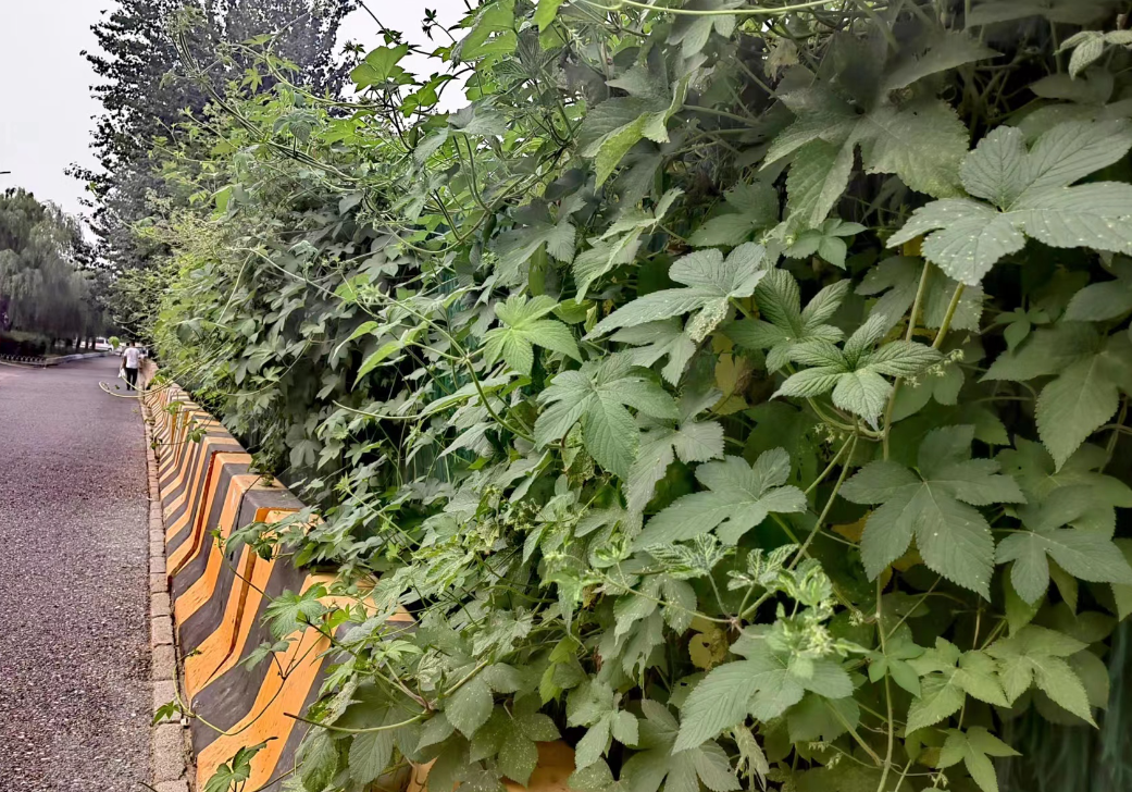 9月5日,记者在瀛海地铁站附近看到一片攀爬在栏杆上的植物,远远看去犹如一面绿墙,目测有十几米长(见下图)。栏杆上的叶子大小不一,通过识图软件辨别,正是葎草。葎草旁边有同样攀爬整个栏杆的草,看起来跟葎草十分相似。这些不同的草相互缠绕,葎草很容易隐身其中。这种葎草在一些社区公园的围墙上也很常见。