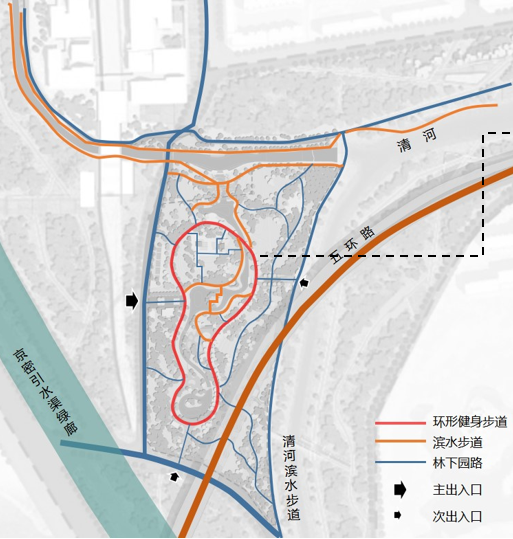 通过构建840米环形健身步道和666米滨水步道微循环,打通区域慢行绿道断点,联通“三山五园”、清河、京密引水渠及香山绿道体系,形成片区慢行绿道大循环。