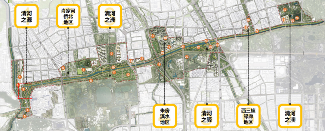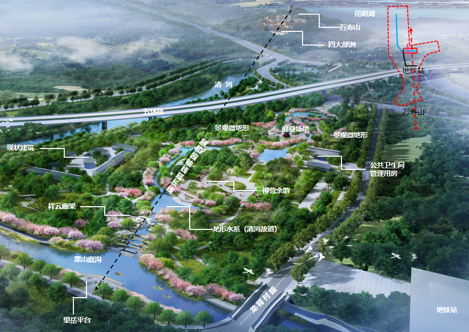 此外,“清河之源”滨水公园还将恢复部分清河故道,融合青龙桥片区文化风貌,重现区域文化记忆,确立“三山五园”景观轴线。