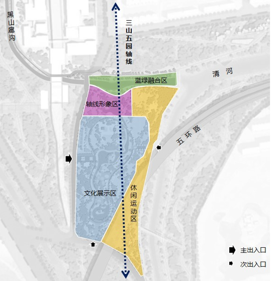 根据轴线关系及空间属性,设计蓝绿融合区、轴线形象区、文化展示区、休闲运动区。