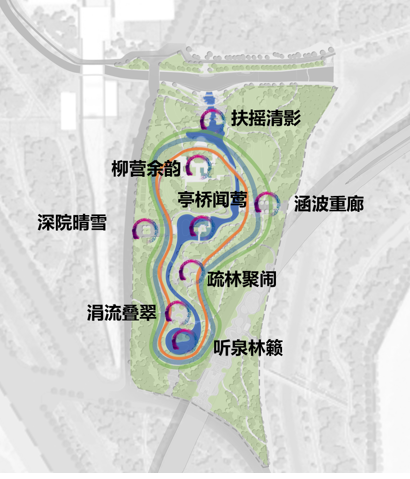 通过慢行步道串联亲子型活动场地、适老型活动场地及休闲文化广场, 打造8个新文化节点,分别是:扶摇清影、涵波重廊、疏林聚闹、听泉林籁、涓流叠翠、深院晴雪、亭桥闻莺、柳营余韵。