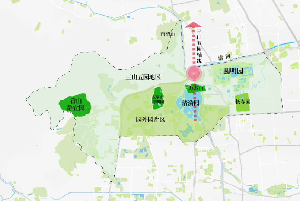 确立万寿山智慧海到望岳平台之间的“三山五园”景观轴线。沿轴线视野,架构河道、跌水、云形廊架、微地形、万寿山景观层级递进的视觉效果,提升“三山五园”轴线景观品质。