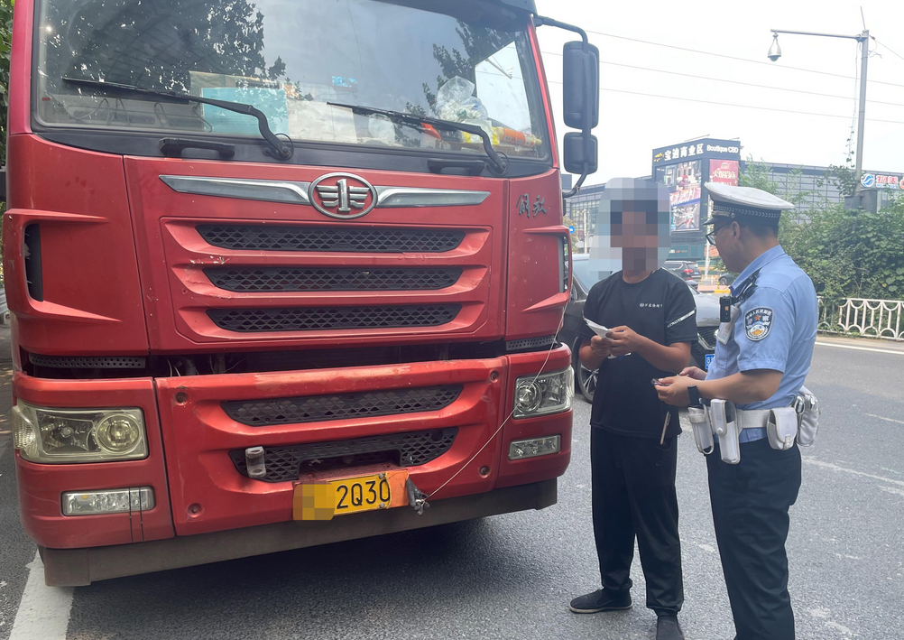 9月16日13时10分,昌平交通支队沙河大队的民警田海峰在定泗路巡逻的过程中,发现对向车道驶来的一辆大货车,前部号牌明显不对劲。田海峰随即示意驾驶员停车接受检查,他走近了发现,这辆车前号牌上套着一只橙色手套,手套上还系着一根绳子,顺着绳子往上看,它连着驾驶室。再定睛看一眼,橙色手套将车牌尾号遮挡得严严实实。
