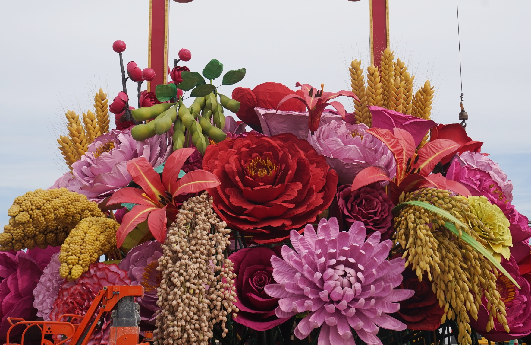 篮内选取了美好寓意的花卉和喜庆丰收的五谷,体现花团锦簇、五谷丰登的美好生活图景。