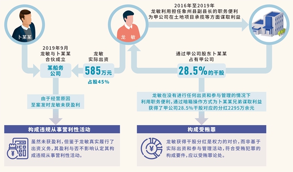 本案中,龙敏有两个持有股份的行为。第一个行为是与卜某某合伙成立某船务公司,龙敏实际出资585万元(占股45%)。虽然由于经营原因,至案发时龙敏未获盈利,但鉴于其真实履行了出资义务,其获得盈利与否不影响认定其构成违规从事营利性活动。第二个行为是龙敏在甲公司占有干股28.5%,并持续获得该股份对应分红。第二个行为从表面上看与成立某船务公司的行为类似,但二者有着本质区别。龙敏在没有进行任何出资和参与管理的情况下,利用职务便利,为卜某某兄弟谋取利益,获得了甲公司28.5%的干股,进而获得对应分红。龙敏获得干股分红显然是权力的对价,而非基于实际出资和参与管理活动,符合受贿犯罪的构成要件,应以受贿犯罪论处。