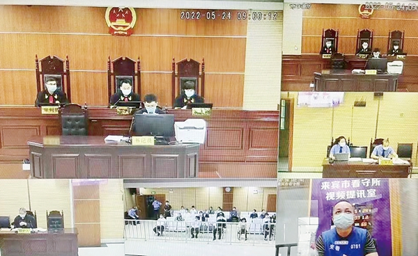 2022年5月24日,来宾市金秀瑶族自治县人民法院开庭审理龙敏涉嫌受贿罪一案。图为庭审现场(视频截图)。金秀瑶族自治县纪委监委提供
