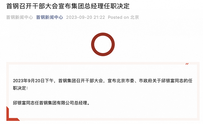 2023年9月20日下午,首钢集团召开干部大会,宣布北京市委、市政府关于邱银富同志的任职决定:邱银富同志任首钢集团有限公司总经理。