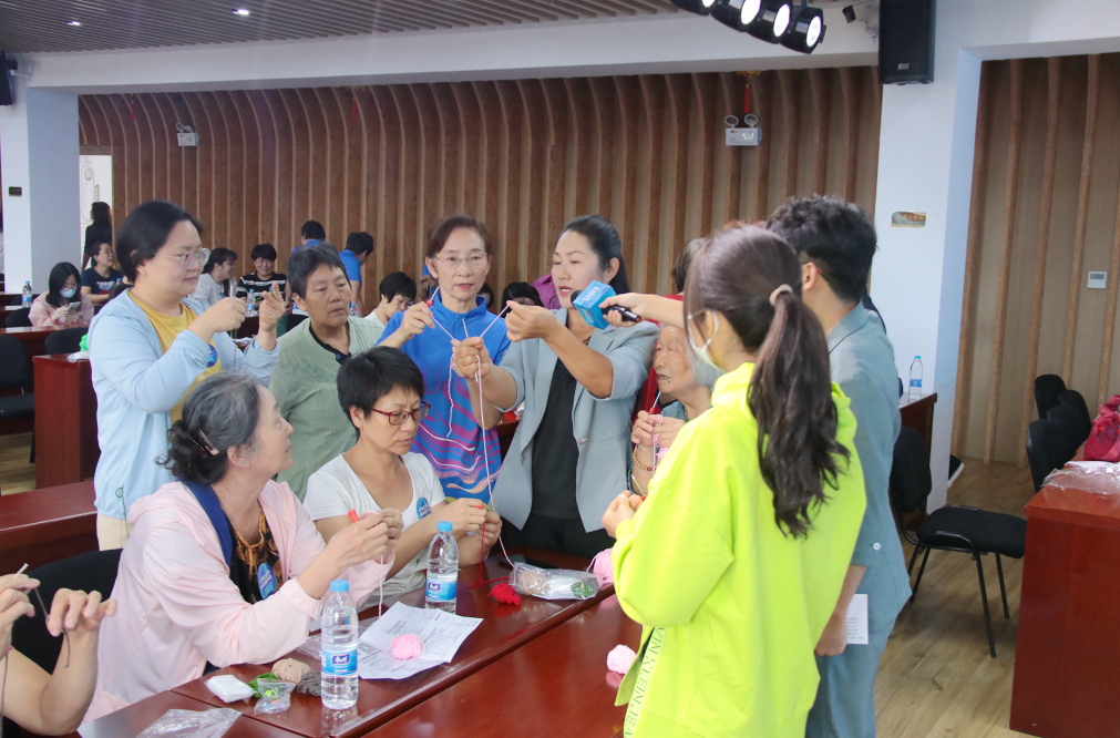 紧接着,一段由八里庄街道艺术团带来的非遗花棍表演《我爱你北京》,节奏鲜明,刚柔并济,让现场观众深切感受到传统文化的魅力。主办方还特别安排了现场嘉宾与社区居民共同体验海派绒线编织技艺,冬奥编织团队的老师向大家介绍编结起源并亲自教授制作技巧。