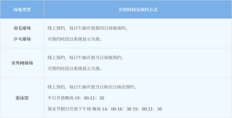 羽毛球场、乒乓球场:可查看和预约当日及未来三日的场地,每天7:30开启预约。