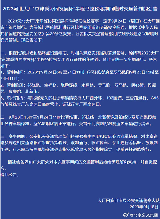 根据《2023河北大厂“京津冀协同发展杯”半程马拉松赛期间临时交通管制的公告》要求,2023年9月24日6时至11时,祁陈路、幸福路、永昌路、双马路、康安路、北新街等地区将采取交通管制措施,途经的816路、817路届时将采取临时绕行甩站措施,待交通管制结束后恢复原路由行驶,具体措施如下: