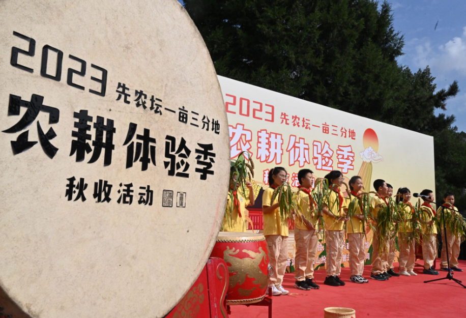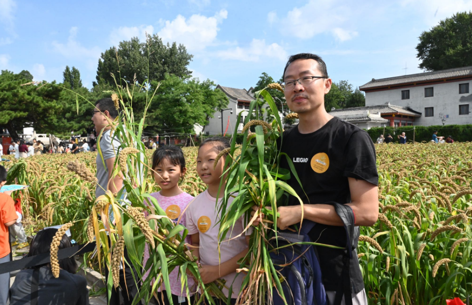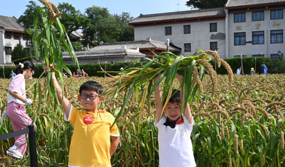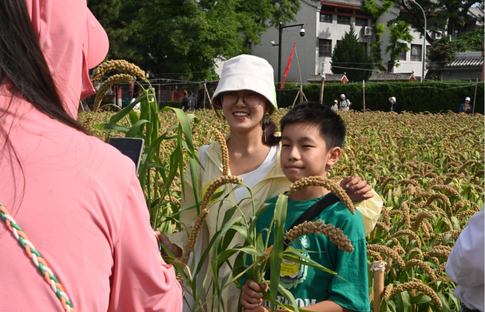 先农坛位于北京中轴线南端西侧,耤田是这里最重要的历史文物景观。明清时期,这里曾是中国古代帝王亲耕农田“劝课农桑 重农固本”的耤田礼活动区。如今,“一亩三分地”里,金灿灿的谷穗压弯了腰。观众们走进耤田,挥动镰刀,收割谷子。“孩子能亲手触摸这些谷物,看看它们在餐桌之外的样子。”市民刘女士带着一岁半的女儿站在耤田里,捧起一穗谷子,她说,这是小女儿第一次与农作物亲密接触,“不仅闺女乐开了花,我也对古代农耕文化有了更深的了解。”