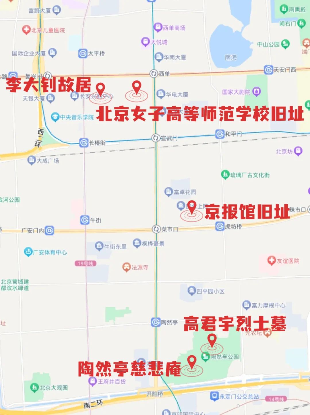 陶然厅慈悲庵——高君宇烈士墓——京报馆旧址——北京女子高等师范学校旧址——北京李大钊故居