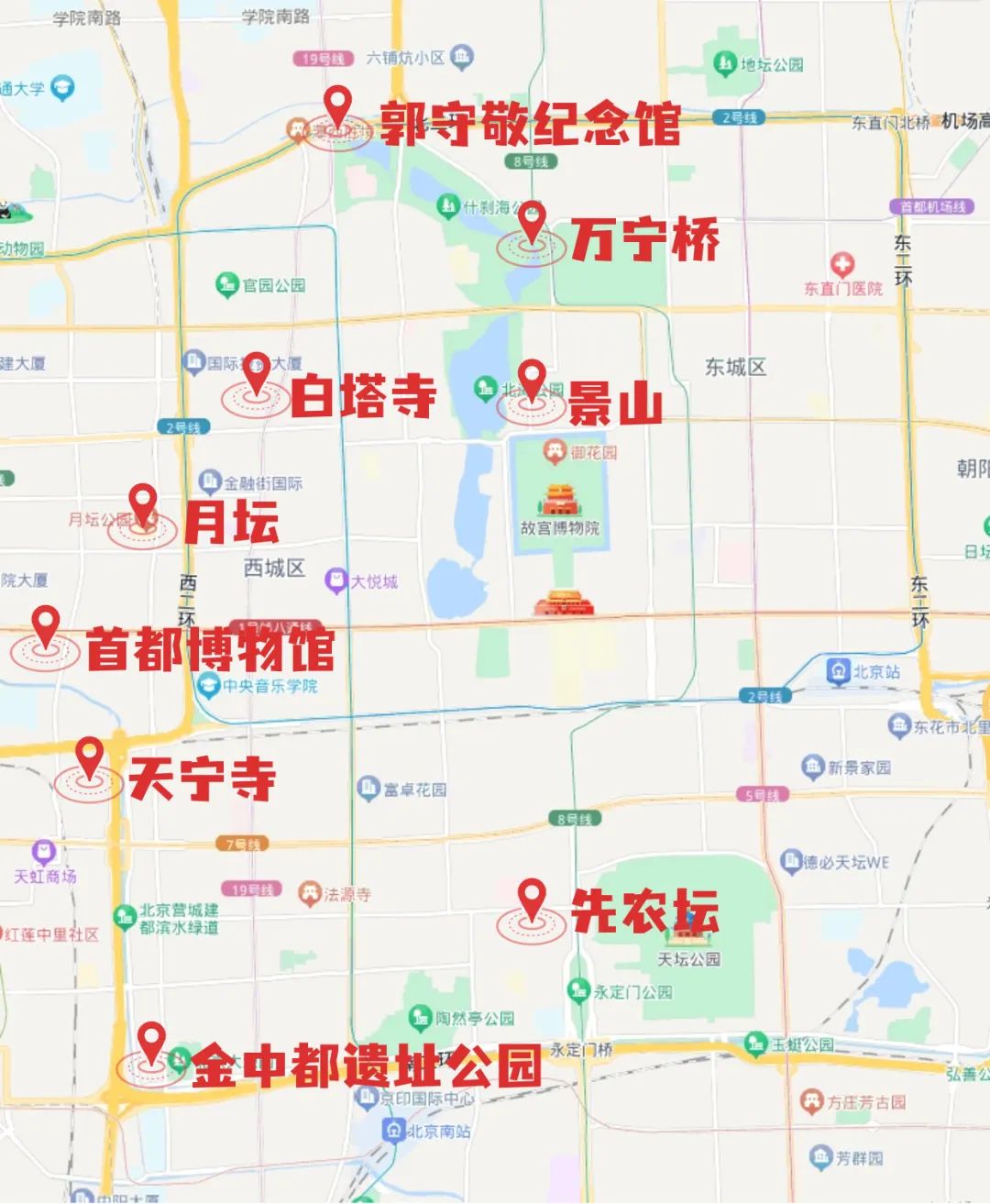 北京郭守敬纪念馆——万宁桥——景山——白塔寺——月坛——首都博物馆——天宁寺——金中都遗址公园(蓟城纪念柱、建都纪念阙)——先农坛