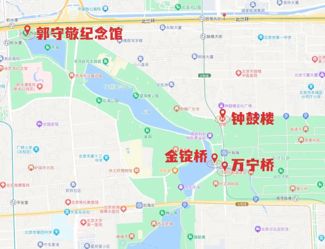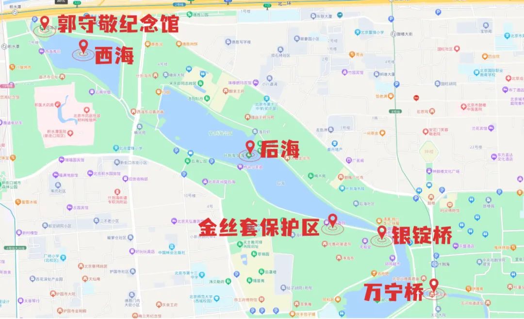 万宁桥——金丝套保护区——银锭桥——后海——西海——北京郭守敬纪念馆