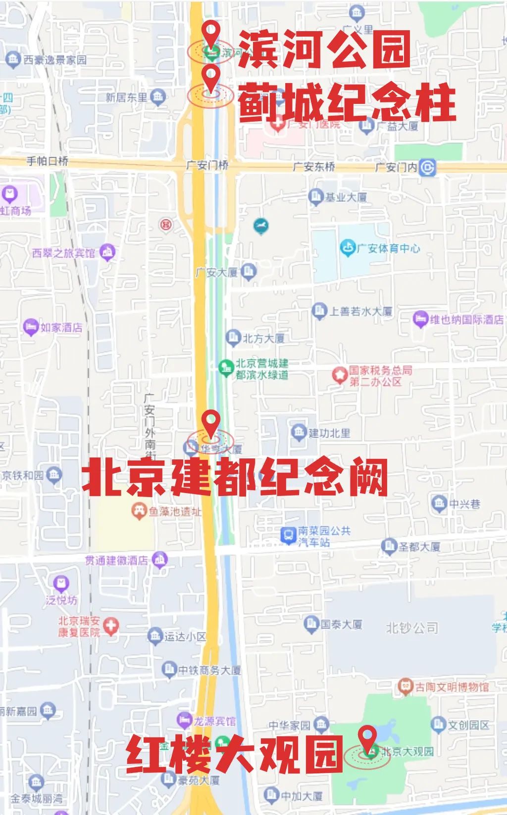 红楼大观园——滨河公园——北京建都纪念阙——蓟城纪念柱