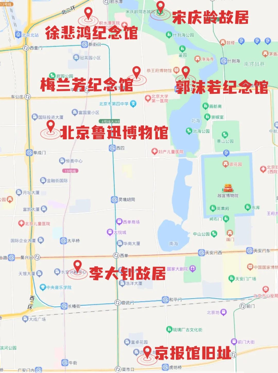 京报馆旧址(邵飘萍故居)——北京李大钊故居——北京鲁迅博物馆——徐悲鸿纪念馆——宋庆龄故居——郭沫若纪念馆——梅兰芳纪念馆