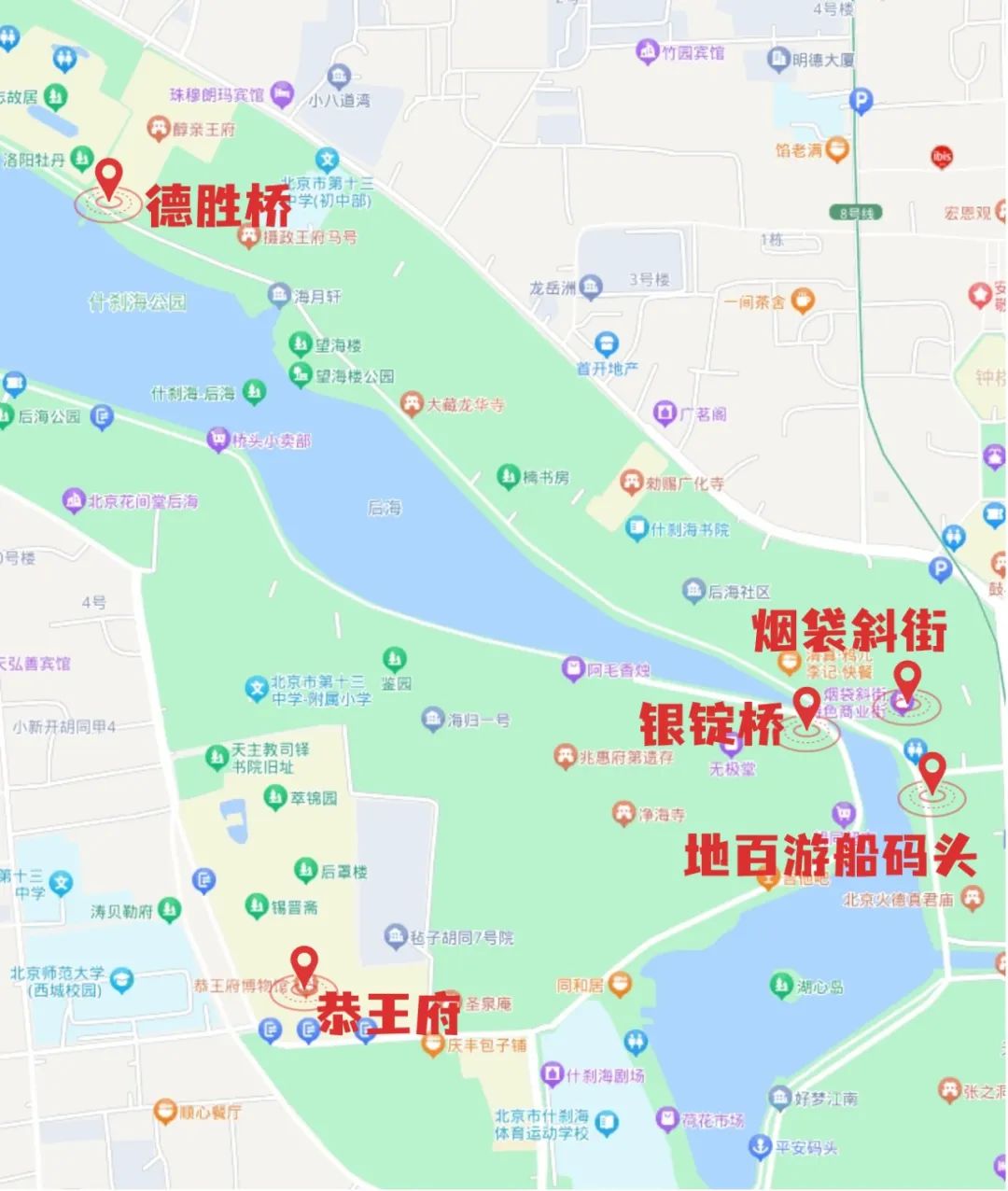 烟袋斜街——银锭桥——德胜桥——恭王府——地百游船码头