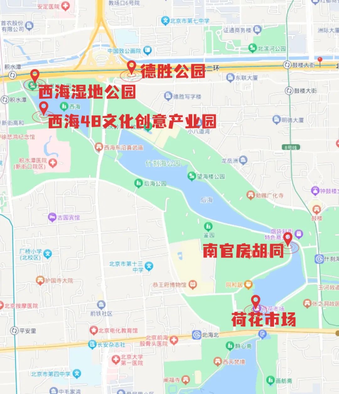 西海湿地公园——西海48文化创意产业园——德胜公园——南官房胡同——荷花市场