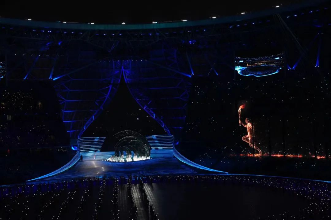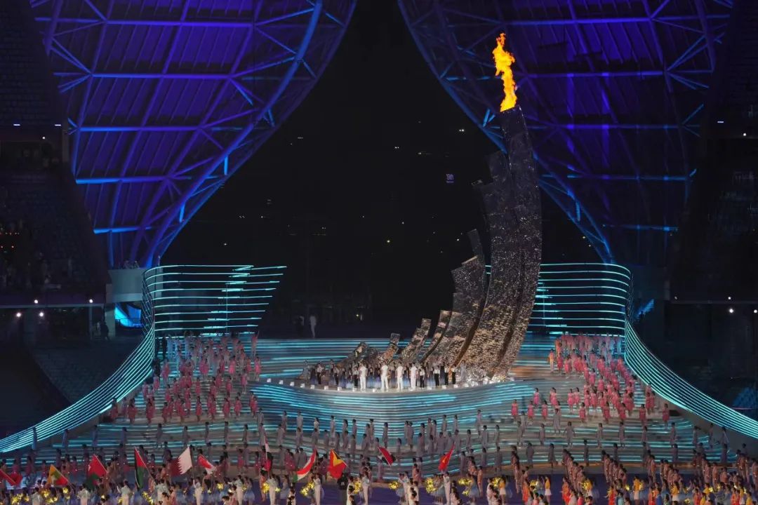 开幕式现场,内场火炬手叶诗文、樊振东、徐梦桃、石智勇、李玲蔚、汪顺依次传递火炬。与此同时,承载着全亚洲亿万人热情的“数字火炬手”跨越钱塘江,奔跑而来。