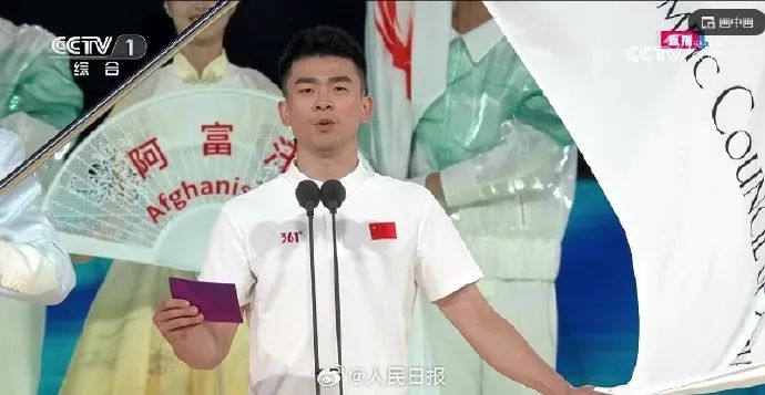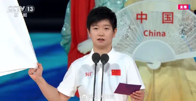 中国羽毛球运动员郑思维、乒乓球运动员孙颖莎,代表全体运动员宣誓。值得注意的是,二人是用英文宣誓的。
