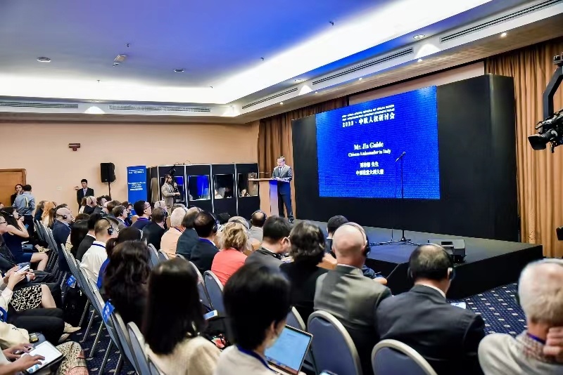 中国驻意大利大使贾桂德在“2023·中欧人权研讨会”上发言。(中国人权研究会)