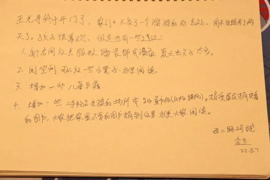 此外,在茶空间的留言簿上,居民们纷纷写下了自己的期待与感悟。一句句真挚的话语凝聚着回龙观力量,汇聚成一句话:希望我家会更好。
