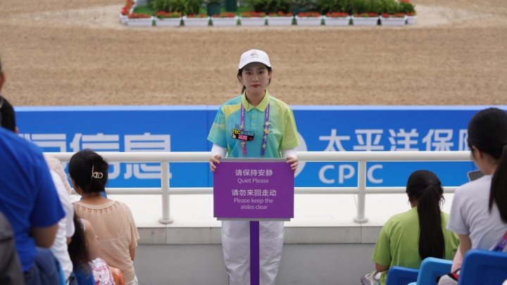 当第一名选手身穿一身骑装,飒爽出场时,立即引来不少欢呼声。场内的志愿者不得不示意现场观众保持安静,比赛间隙,场馆语音播报提醒:“在比赛过程中请保持绝对的安静,不要鼓掌、不要使用闪光灯拍照,请不要在看台上跑动,避免影响参赛马匹”,提醒观众注意马术比赛的观赛礼仪。