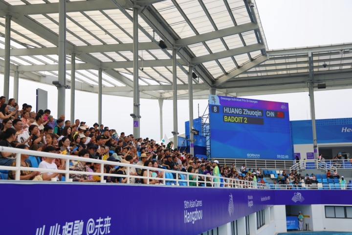 但观众还是用自己的方式,表达着对这场家门口举办的比赛的热情。开赛前一小时,桐庐人汪先生就来到现场,他表示,来之前已经提前“做功课”,百度了马术比赛的规则。“家门口的比赛,过来感受下亚运氛围。”