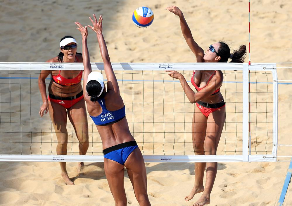浙江宁波进行的杭州亚运会沙滩排球女子半决赛中,中国组合薛晨/夏欣怡以2比0战胜队友王凡/董颉,晋级决赛。