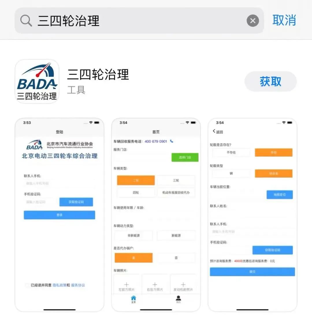 三、通过手机应用程序下载App“三四轮治理”进行信息自助填报车辆信息,方式如下: