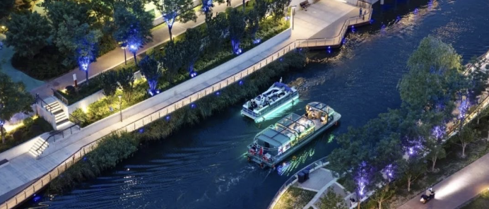 亮马河流经各国使馆、国际酒店、潮流商圈等区域,连通周边23个居民小区、让“1河2湖24桥18景”一船可览。