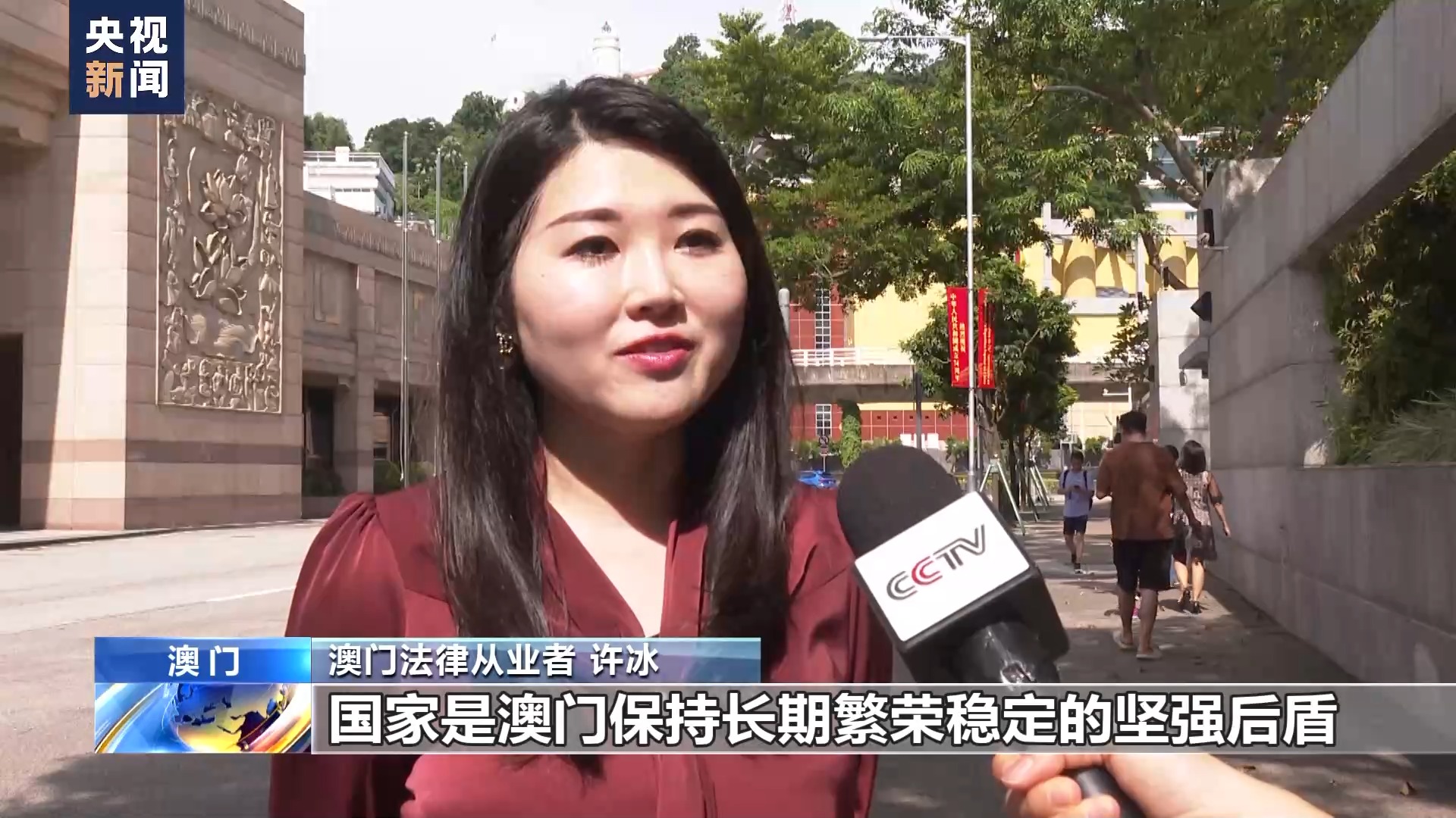 澳门法律从业者 许冰:国家是澳门保持长期繁荣稳定的坚强后盾。国家也为我们澳门青年融入国家发展大局提供了切实有效的方法和路径。我对未来充满信心和希望,明天会更好。祖国好,澳门会更好。